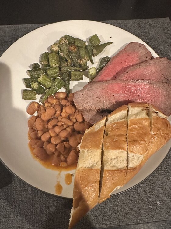 22. Santa Maria tri-tip with beans, okra and a surprisingly good frozen pretzel bread.