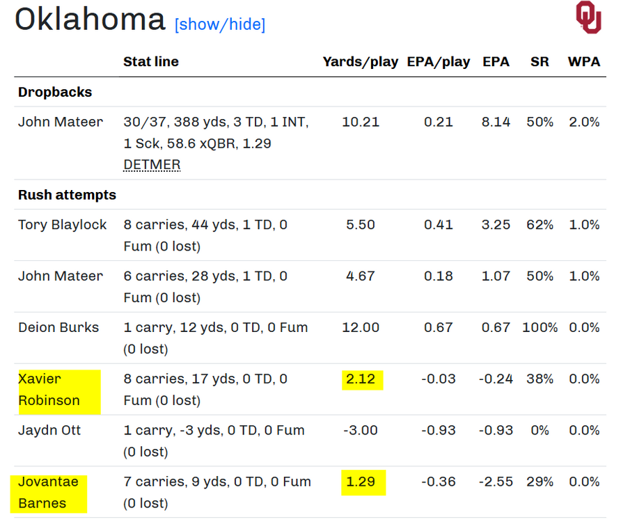 1. damn dude, you weren't kidding about how bad they were running it. thought i'd look at highlight yards to see how they did there (basically yards that go to the RB vs the OL) they averaged 0.97 per opportunity which is horrible, especially against that level of competition. for comparison, ISU averaged 5.17 highlight yards per opportunity. Texas averaged 1.58 per opportunity vs tOSU and tOSU averaged 0.45 against the Texas defense. OU got "stuffed" (yards gained <=0) at the same rate vs ISU at 19% as tOSU did vs Texas (21%) and got "stopped" (yards gained <=2) at basically the same rate as tOSU (OU = 45%, tOSU = 50% - with the clear difference that the Texas defense >>>>>>>>>>>>>>>>>>>> Ill. State defense. they basically gave 1/3rd of their carries to dudes and got nothing out of them. did i need to go this in depth? obv not but fuck those guys, if they can't run for shit vs Ill. State they are going to struggle against basically their entire schedule.