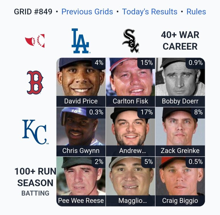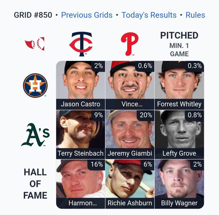 Yesterday ⚾️ Immaculate Grid 849 9/9: 🗄️ (from the archives) Rarity: 53 IMMACULATE! 🟩🟩🟩 🟩🟩🟩 🟩🟩🟩 Today ⚾️ Immaculate Grid 850 9/9: Rarity: 56 IMMACULATE! 🟩🟩🟩 🟩🟩🟩 🟩🟩🟩