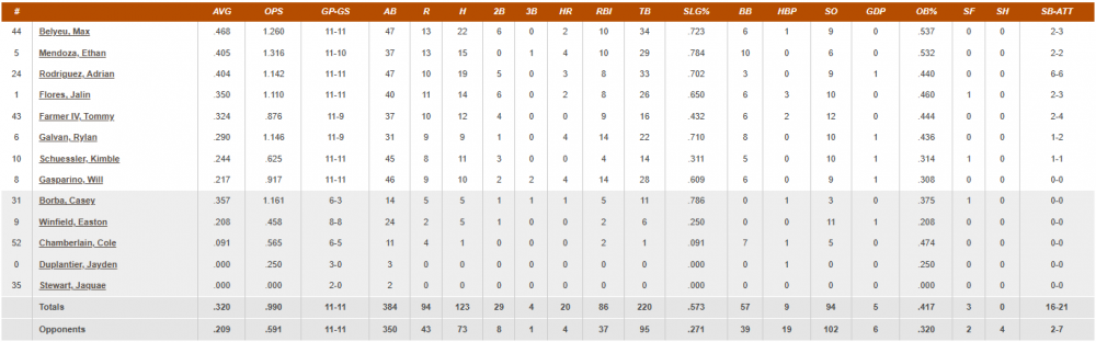 Remaining SEC Series Georgia RPI #1 at Kentucky #51 Auburn #14 A&M #100 at Arkansas #3 Florida #25 at OU #9 Non-Con Texas St #128 Houston Christian #79 UTRGV #16 at Texas St #128 Prairie View A&M #297 Lamar #55 Q1 games remaining: 19 Q2: 0 Q3: 7 Q4: 1 Other than A&M, all remaining SEC games are against current Q1 competition. And UTRGV a sneaky #16. Will be doing pretty well going 12-9 for remaining SEC games, 5-1 in non conf (one of UTRGV, Lamar, or Houston Christian in a UTSA redux). Would make a regular season record of 40-13.
