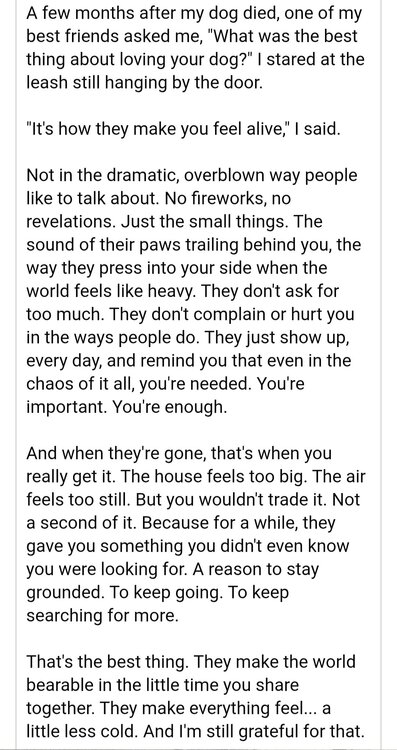 6. When Amber, my dog of 16 years, passed I had no idea what to do with myself. No more morning walks, feeding times, park trips just for her. I live alone so the emptiness at home was just crushing. I lasted about 2 months before I picked up Luna. 8 years later and I can't imagine life without her. With me through the snowpocalypse, covid, etc. Some angels dont have wings.