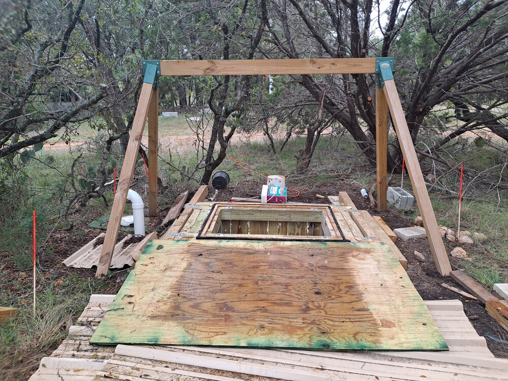 19. It's been wet. I flipped over the to and let things air out. I'm a little concerned how moist things get. To that end l cut off 18" from my sophisticated playset head-frame. I immediately bumped my head on it. My plan is to construct a 12x12 or so shed roof. I'm hoping that will shield enough water. Also I could maybe put in some diverters (maybe out of dryrock?) to diverts surface water.