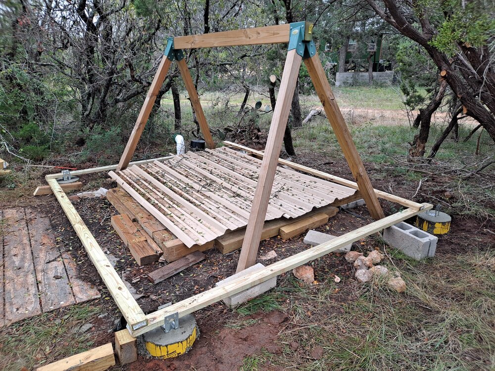 2. Plywood, per suggestion. Also added 3 more purlins. Bought some screen mesh. The "lid" will be a little bit elevated. Hopefully air it out without inviting critters inside. 2024: no more excuses. Diggy hole.