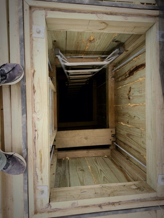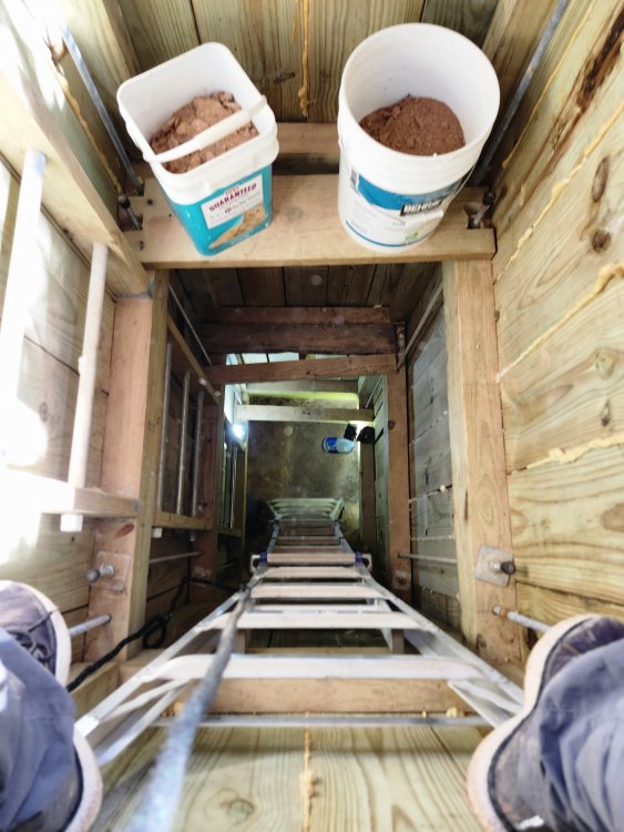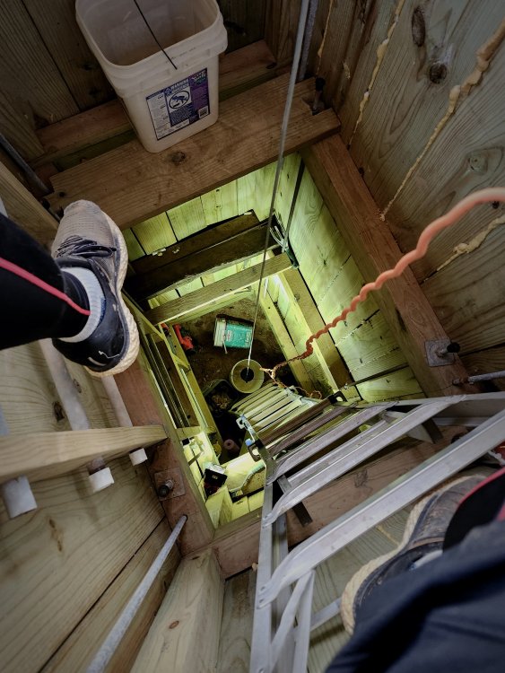 Nice Saturday. Got after it about 3 hours. Not a big update, but satisfying. Used the big jackhammer today. Very hard rock layer. I'm now about 5 ft below the third set. So that means I can get started getting the entire bottom to that level. It is a little easier to widen than to dig deeper. Separating the big rocks from the gravel (& from the dirt) adds a bit of extra time. But I feel it's worth it, as the gravel is useful. My little metal screen fits on the top of a 5 gallon pail (seen below with the scooper I use). The lighting is via 18v doodads. Deepest section (about 1/2 or 1/3 at the moment) is down to 17'2" according to the boy. I have a couple paint or pool chemical pails, and they are just a little bit bigger than a 5 gallon handy pail. Enough that they are frankly too heavy. I've found it's fastest to lift up each bucket (2 or 3 buckets each time), rather that use an electronic hoist or manually with the pulley. The 2x's across the sets are enough space to hold em as I pull them up. So figure 3x 40-50 lb kettle bell clean lifts from 17' to 12' (sucks, not just handle to chin but bottom of bucket to chin) then 12' to 8', 8' to 4', and 4' to surface. So 12 reps each time I scramble up. Probably get 4-6 buckets per jack hammer pass. I didn't set up the hoist today, and only used the pully to raise and lower the jackhammer. You can see the rope dangling in these photos. Fairly busy second half of February into March, so I'm not sure when I'll get the whole thing down to about 17'. I haven't purchased the 4x6s for the fourth set yet, but I do already have the 5/8 threaded rod and the 1.5" angle iron for side lagging ledges. Not sure if I'll add fifth set. I could start building up some concrete and rebar in lifts. But I dunno... if I got to where the rock stops, it would be mighty tempting to try and find the water table. I'm trying a thing where I dump a gallon of 10% vinegar when I leave for the day. I dunno, maybe it will help loosen up the limestone and caliche. Make em more friable. Stupid, but it's only like a bucket. Winterized the cabin extra well. Temp in the teens expected. Gravel spread on the dirt road, and dumped the rock and dirt in my sisphyean ravine. Dozens of cubic feet poured in and I can't say it looks all that much more filled in. All you can do it do it like Johnny Cash. It don't cost me a dime. (except the couple grand I've spent, excluded gas) Did the traditional DQ chicken strip country basket and blizzard when we hit town. Oh, cat got rehomed and mom's house goes for sale next week. Fuckin' a.