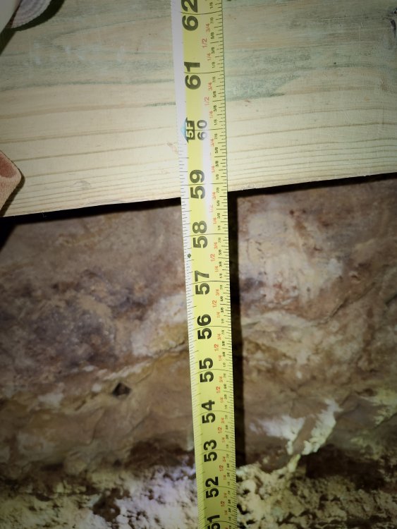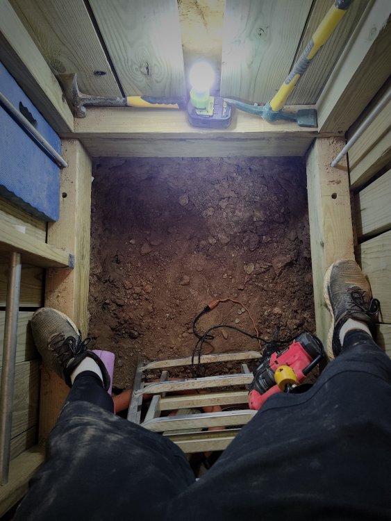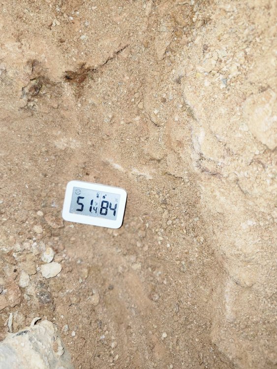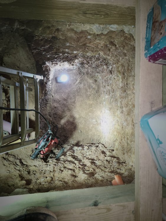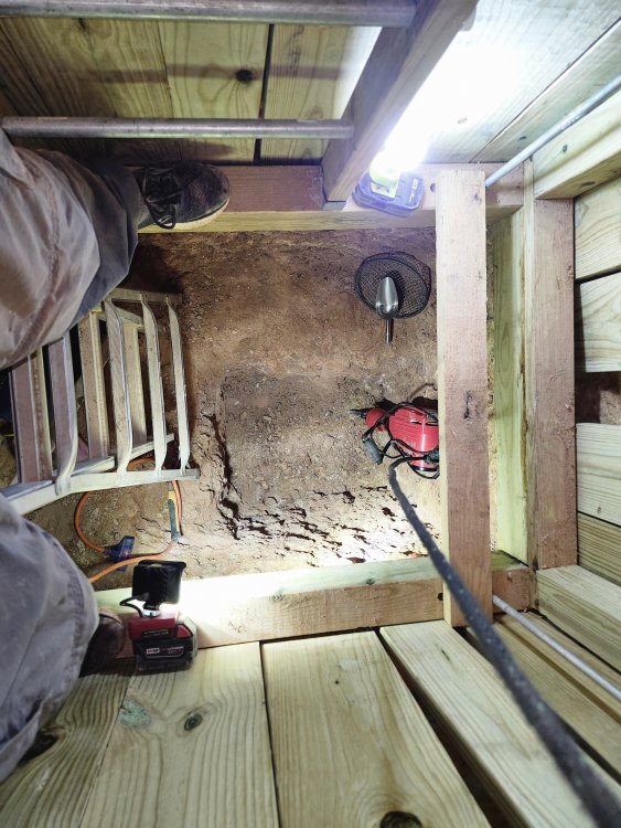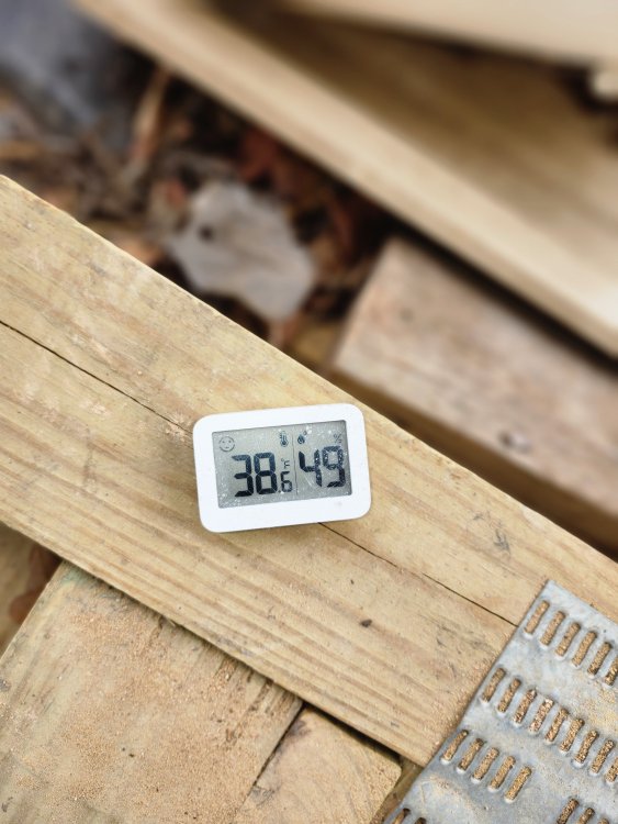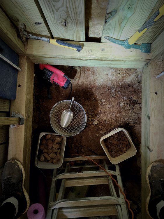Freezing rain? Fuck it. I have dirt that needs moving. Existing deepest part 24" x 30" and 59" below the third set. LFG. Knocked it out. How many buckets? Many buckets? How many advil? Many advil. Good enough to switch the ladder from one side to the other. Dropped it into the deeper section. Mase it 2 rungs taller. Running out of rungs. It got a little deeper. Because when you've got the jackhammer down there, might as well break some limestone. Whateveredge is down there is some hard damn rock. Pondering on investing in steel 5 gallon buckets. Three for $50 on amazon. Maybe I need a gofundme. This crappy thermometer gave me a reading above the hole: My phone said it was 33 degrees. So maybe it runs hot. A balmy 51.4. A delta of 15 to 20 degrees. And that was up higher, didn't have room in the deeper section. Not sure when I'll get up there next. Felt like good progress today.