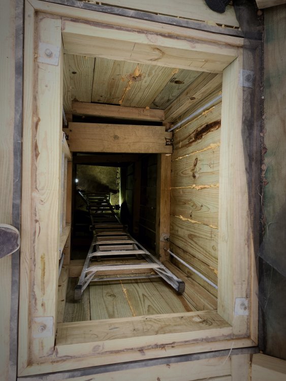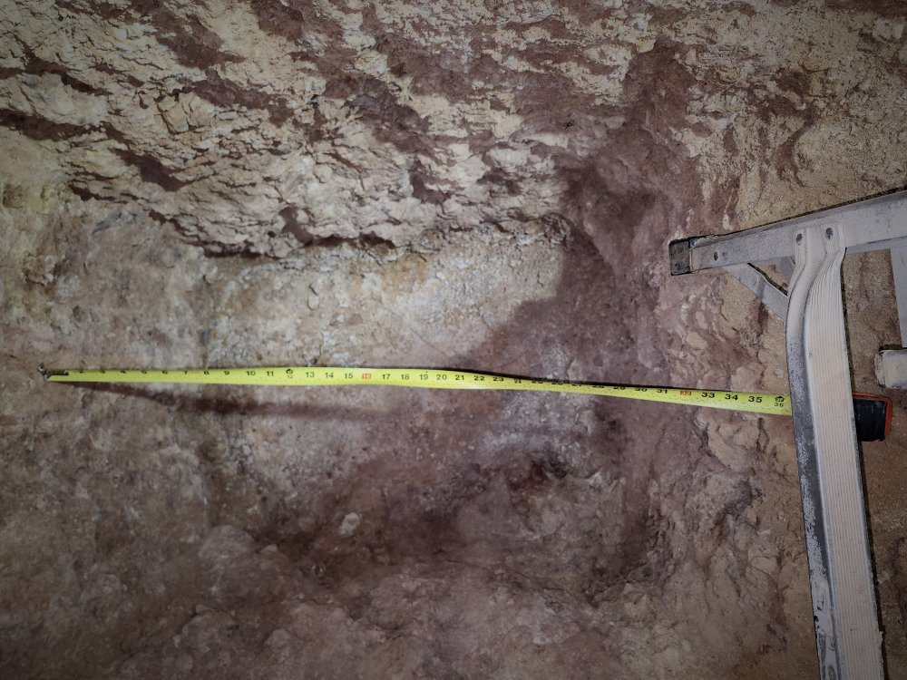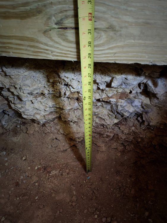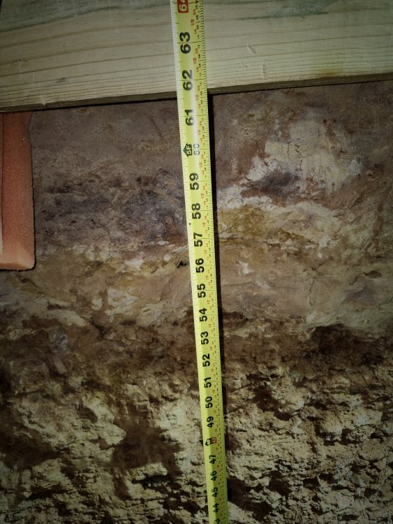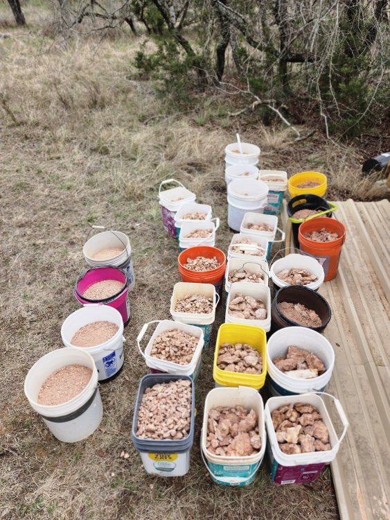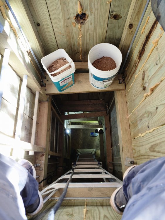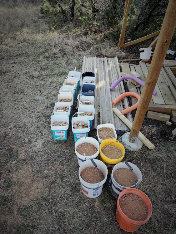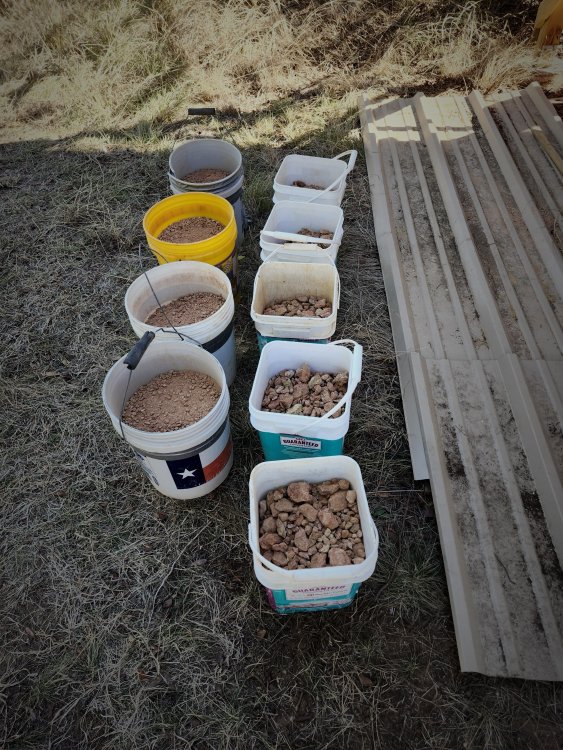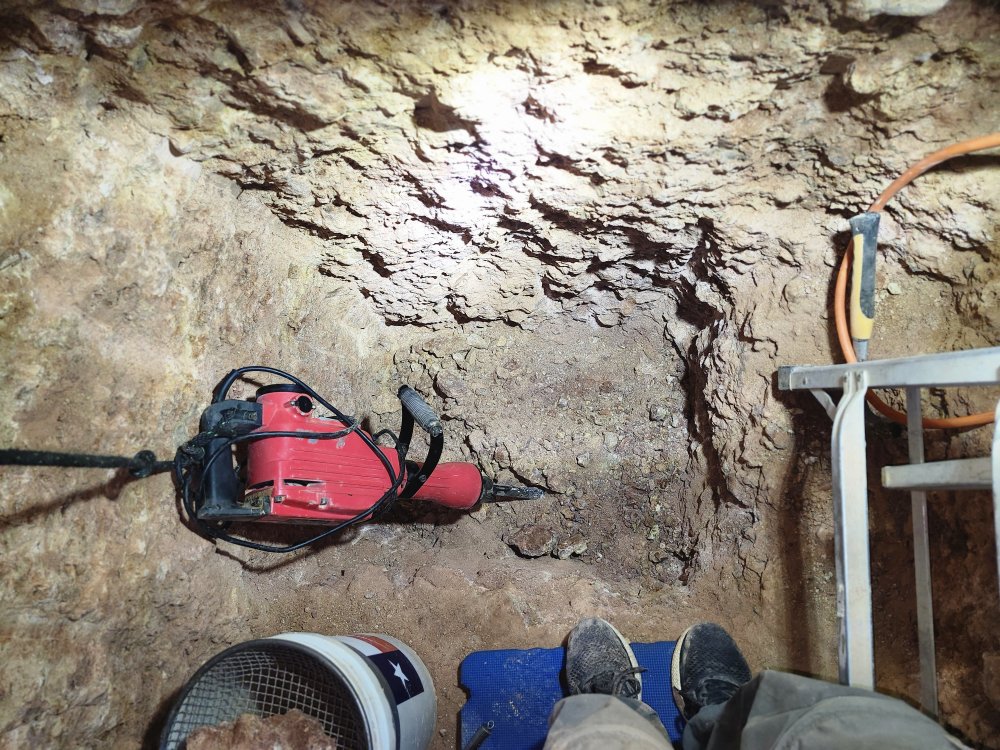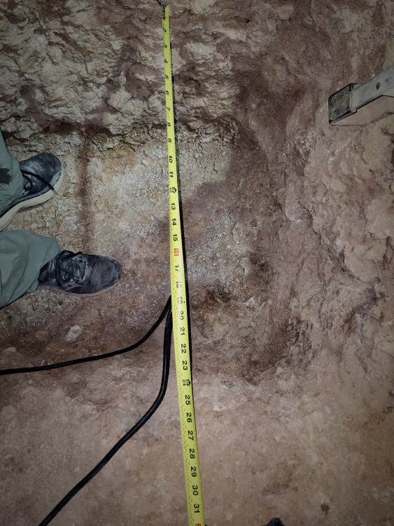 Sent up on Saturday. I was about 4" under the third set (each set is about 48" from center of 4x6 to the next 4x6, although the top set rests above ground. But for simplicity, 4 ft per set). This is anprettynrocky layer. Got a good part of the bottom down to: I have a ladder, so I'll need to move it to get the whole bottom. As a reminder the inside dimensions are 30"x48", so the full hole is ~40" (30+3.5+3.5+1.5+1.5) by 58. Realistically I need space to to push threaded bolt down and tighten nuts, so I usually go down ~54 inches before I put in a new set of lumber. It seems quicker to jump up a set and pull up a bucket in 4 ft increments rather than use the hoist. I save the hoist for lowering and raise the hammer drill, as it's awkward to climb a ladder holding it. The handheld hammer drill is great, but it does struggle a bit when I get a shelf of solid rock. Next time I may use the full size jackhammer. The handheld is really great at embiggening the walls. I have a tendency to want to go deeper and then have to spend a trip or two getting the width right. The last 2-3" have been pretty hard. Usually it's partially calculated caliche (my heat guess I was a business major) where the rock comes apart fairly easily (resists a shivel, but a rock hammer splits easily). This layer had actual quatz: So prettty tough stuff. Mule is in shop for its first ever annual maintainance, so I didn't haul off the bigger rocks and gravel. Next time I'm up I've got a good dozen buckets of abiut 1/2 to 3/4 gravel that I'll spread out on "road" and another half dozen buckets of larger rocks I'll throw down a ravine. My aim is to build it up enough to drive the mule across. That's the property fence line, and my current path cuts down a hill. This route would be more gradual.
