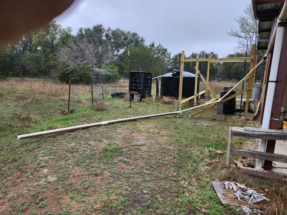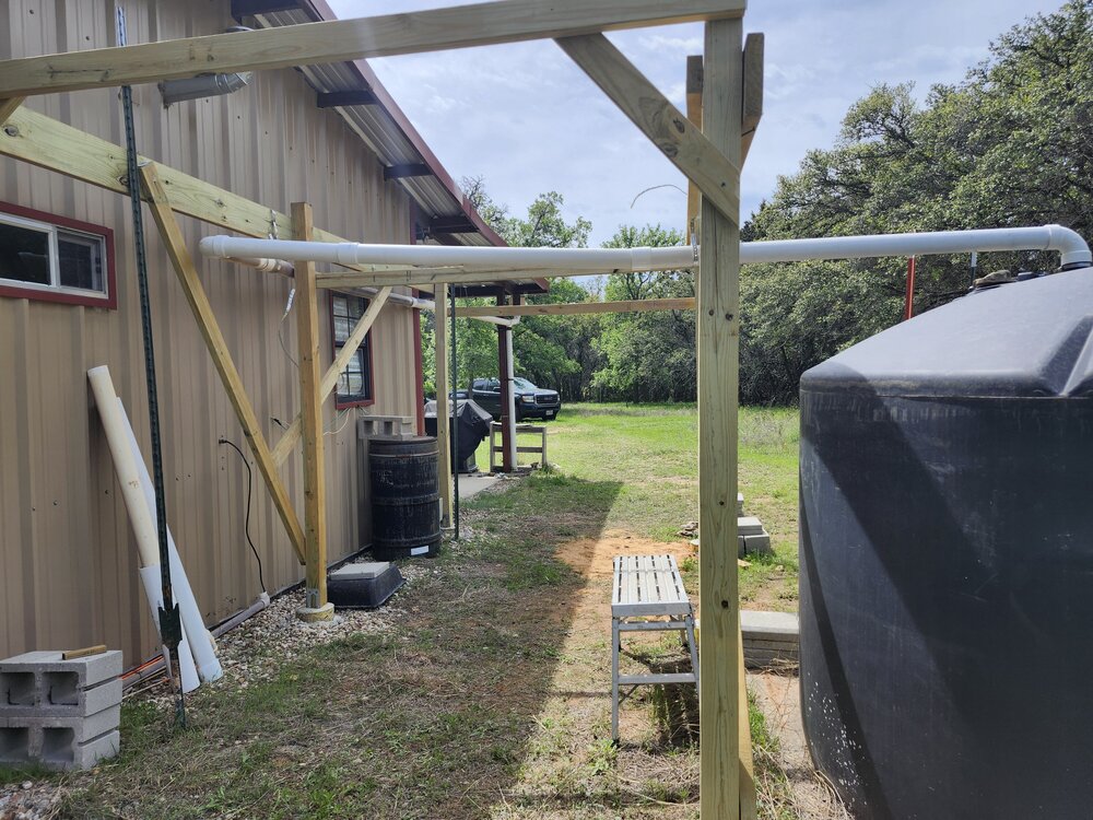 random shot. Way in the corner is the leaf diverted and the vertical pvc is the first flush. I should have the tank right there, but instead I have these aqueduct to take the water to the 1550 tank. It used to be a straight shot, but I built a carport to park a kawasaki mule. Next Pic shows tank. The bulkhead and important buts are in that wood box. Inside is a ball valve. The pipe goes to a hole in the screw top lid. There is a screen there. Overflow goes to a trough. Lil oak is in the wire cage. Temp piping because O was building the carport amd it started raining on me. Thumb top left. -