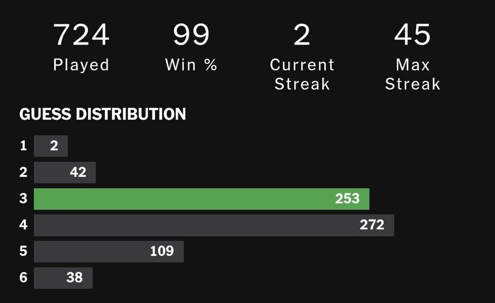 3. Wordle 1,431 3/6* ⬛⬛⬛⬛🟩 ⬛🟨🟨🟨🟩 🟩🟩🟩🟩🟩