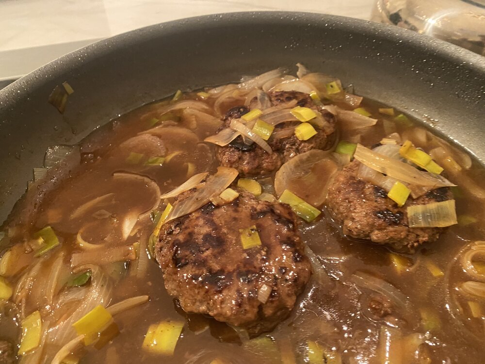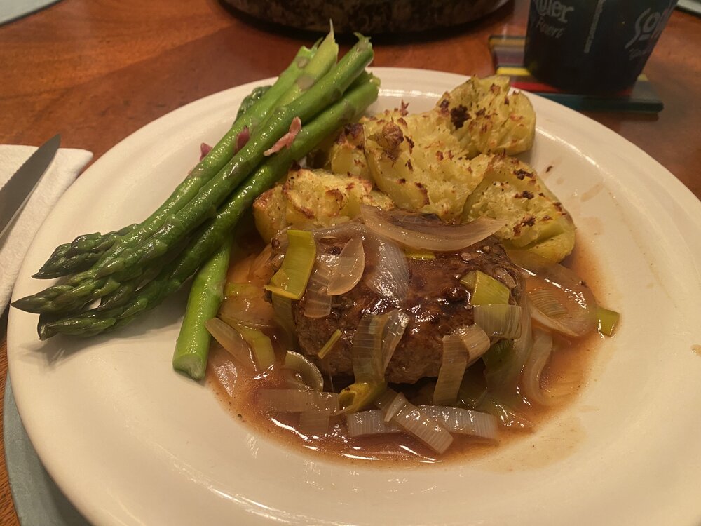 23. Kids requested old school hamburger steaks tonight. Went crazy and added some leeks in addition to the usual onions (or Onyawn as Justin Wilson would say). My bride whipped up these bad ass oven baked potatoes she cooks with some sautéed asparagus.