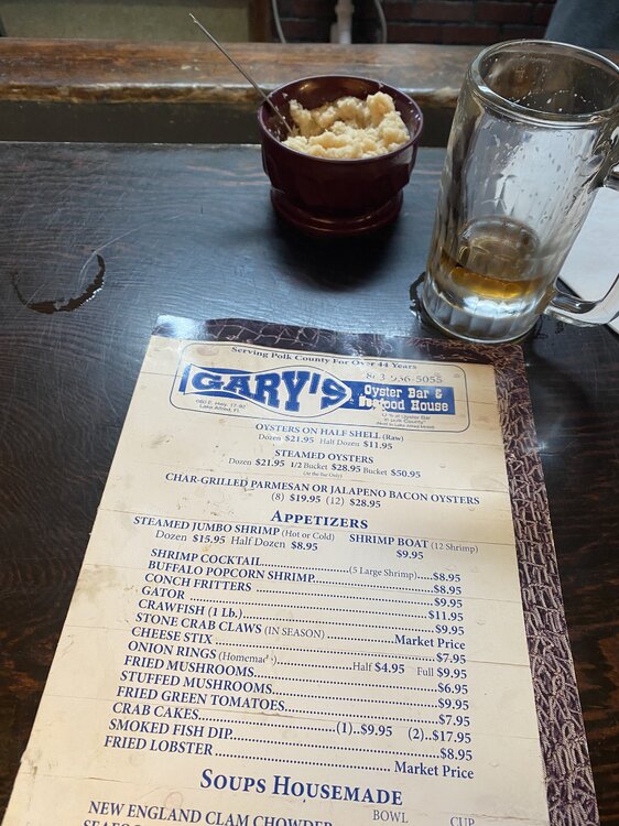 PSA for anyone who travels to Orlando for work or family trips. I was there last week and wanted to escape the Disney industrial complex for a great dinner with my wife. I wanted something outside of Orlando and searched for seafood restaurants in surrounding towns. One place popped up, Gary’s Oyster Bar, that is in a small town called Lake Alfred, FL. We made the 45 minute drive (less than 30 minutes without traffic but I-4 is a bitch almost 24/7) southwest of Orlando to Lake Alfred. Luck was on our side as this place was spectacular - true oyster bar with fresh shucked local oysters from Yankeetown, FL, great appetizers and sides, perfectly grilled fish, and $3.50 draft beers. Grilled Red Snapper over a bed of Cajun cheese grits and perfectly cooked fresh hushpuppies. Couch fritters and crab cakes were outstanding as well. Great folks at the bar with an older couple of Kentucky who’d been on a month long fishing trip to Lake Okeechobee and were returning home. They said they discovered this place twenty years ago and have been stopping on their return trip every year. Breath of fresh air from Orlando… To sum things up, this is the kind of place Mike Leach would have loved.