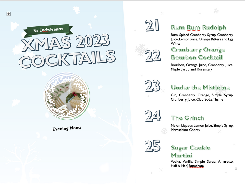 I went a different direction with my "Christmas Menu" this year. Visiting family out-of-state, with others coming from Colorado, Minnesota, Wisconsin. I'm the "designated cocktail guy", so I went more structured this year... Was a big hit, with the "Rum Rum Rudolph" being the most favored (of course it was the first day, so not the best choice by me I guess).
