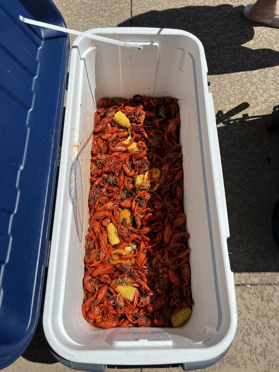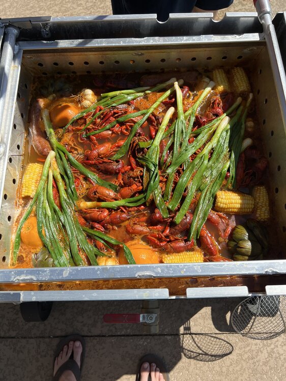 I use Zatarains powder. There are directions on the jar, but we have our own method that comes down to taste and experience. We usually do about a third of a jar on the first batch, that’s mild for the casual eaters. We add oranges to the boil as well. Cook potatoes, garlic, and artichokes first. When the potatoes are halfway done add corn and sausage. When potatoes are close to done add bugs, green onions, and 2 sticks of butter. Time will depend on your cooker and size of veggies. Once the bugs float, which only takes a few minutes we kill the fire and let them soak for 20. After that we dump half a jar, and start over. Heat goes up each batch. Final batch we also do a cold soak. After the 20 minute hot soak we drop in half a bag of ice and soak for another 20. Ideally you would cold soak each batch, but we are lazy and our cooker isn’t massive. Start to finish it’s about an hour and a half of cook time, add whatever it takes to get your cooker up to a boil for the first batch.