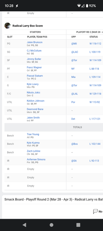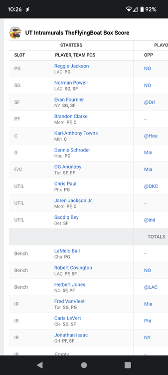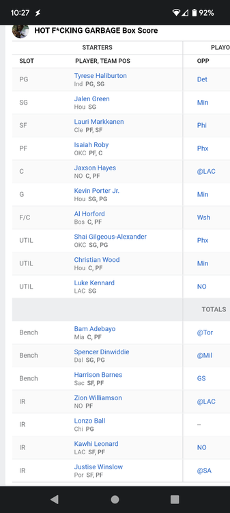 Ok @Capn81 please decide if you want to take over UT Intramurals TheFlyingBoat, Hot F*cking Garbage or Radical Larry. Reminder is you can pick up to 2 players to keep drafted in Round 3 or later, and they will replace your draft pick this year one round earlier than they were selected below. Please post up which roster you want to keep - don't need to lock in your keepers yet. (Side note/question - is there anything to prevent us from 'keeping' a guy who was drafted but did not end the year on our roster? Rosters on the site are wiped out so pretty hard to track. Example, I drafted John Wall in the 12th last year but cut him when it became apparent he wasn't going to play) Round 1 NO. PLAYER TEAM 1 Nikola Jokic Den, C Radical Larry 2 Luka Doncic Dal, PG Ballamatic Bevo 3 Stephen Curry GS, PG Baboon's Goons 4 Giannis Antetokounmpo Mil, PF Omar Comin' 5 James Harden Phi, SG 🤑 DONE DURDY 🤑 6 Karl-Anthony Towns Min, C UT Intramurals TheFlyingBoat 7 Joel Embiid Phi, C 30 Day RiskFree Ergatta 8 Bradley Beal Wsh, SG Chief Sitting Out 9 Damian Lillard Por, PG HOT F*CKING GARBAGE 10 Paul George LAC, SF I'M RICK JAMES BITCH!! Round 2 NO. PLAYER TEAM 1 Anthony Davis LAL, PF I'M RICK JAMES BITCH!! 2 Zion Williamson NO, PF HOT F*CKING GARBAGE 3 Nikola Vucevic Chi, C Chief Sitting Out 4 LeBron James LAL, SF 30 Day RiskFree Ergatta 5 Fred VanVleet Tor, SG UT Intramurals TheFlyingBoat 6 Rudy Gobert Utah, C 🤑 DONE DURDY 🤑 7 Clint Capela Atl, C Omar Comin' 8 Donovan Mitchell Utah, SG Baboon's Goons 9 Jayson Tatum Bos, PF Ballamatic Bevo 10 Trae Young Atl, PG Radical Larry Round 3 NO. PLAYER TEAM 1 Jimmy Butler Mia, SF Radical Larry 2 De'Aaron Fox Sac, PG Ballamatic Bevo 3 Devin Booker Phx, SG Baboon's Goons 4 Christian Wood Hou, C Omar Comin' 5 Deandre Ayton Phx, C 🤑 DONE DURDY 🤑 6 LaMelo Ball Cha, PG UT Intramurals TheFlyingBoat 7 Jrue Holiday Mil, PG 30 Day RiskFree Ergatta 8 Russell Westbrook LAL, PG Chief Sitting Out 9 Lonzo Ball Chi, PG HOT F*CKING GARBAGE 10 Tobias Harris Phi, SF I'M RICK JAMES BITCH!! Round 4 NO. PLAYER TEAM 1 Khris Middleton Mil, SF I'M RICK JAMES BITCH!! 2 Zach LaVine Chi, SG HOT F*CKING GARBAGE 3 Jonas Valanciunas NO, C Chief Sitting Out 4 Kevin Durant Bkn, SF 30 Day RiskFree Ergatta 5 Caris LeVert Cle, SG UT Intramurals TheFlyingBoat 6 Michael Porter Jr. Den, SF 🤑 DONE DURDY 🤑 7 Domantas Sabonis Sac, PF Omar Comin' 8 Draymond Green GS, PF Baboon's Goons 9 Ben Simmons Bkn, PG Ballamatic Bevo 10 CJ McCollum NO, SG Radical Larry Round 5 NO. PLAYER TEAM 1 Pascal Siakam Tor, PF Radical Larry 2 DeMar DeRozan Chi, SG Ballamatic Bevo 3 Montrezl Harrell Cha, C Baboon's Goons 4 Jusuf Nurkic Por, C Omar Comin' 5 Cade Cunningham Det, PG 🤑 DONE DURDY 🤑 6 OG Anunoby Tor, SF UT Intramurals TheFlyingBoat 7 Jarrett Allen Cle, C 30 Day RiskFree Ergatta 8 Collin Sexton Cle, SG Chief Sitting Out 9 Bam Adebayo Mia, C HOT F*CKING GARBAGE 10 Ja Morant Mem, PG I'M RICK JAMES BITCH!! Round 6 NO. PLAYER TEAM 1 Jakob Poeltl SA, C I'M RICK JAMES BITCH!! 2 Spencer Dinwiddie Dal, SG HOT F*CKING GARBAGE 3 Jalen Suggs Orl, PG Chief Sitting Out 4 Jaylen Brown Bos, SG 30 Day RiskFree Ergatta 5 Chris Paul Phx, PG UT Intramurals TheFlyingBoat 6 Malcolm Brogdon Ind, PG 🤑 DONE DURDY 🤑 7 Julius Randle NY, PF Omar Comin' 8 Miles Bridges Cha, SF Baboon's Goons 9 Robert Williams III Bos, C Ballamatic Bevo 10 Buddy Hield Ind, SG Radical Larry Round 7 NO. PLAYER TEAM 1 John Collins Atl, PF Radical Larry 2 Terry Rozier Cha, PG Ballamatic Bevo 3 Jerami Grant Det, SF Baboon's Goons 4 Jalen Green Hou, SG Omar Comin' 5 Kristaps Porzingis Wsh, C 🤑 DONE DURDY 🤑 6 Jonathan Isaac Orl, PF UT Intramurals TheFlyingBoat 7 Myles Turner Ind, C 30 Day RiskFree Ergatta 8 Isaiah Stewart Det, C Chief Sitting Out 9 Tyrese Haliburton Ind, PG HOT F*CKING GARBAGE 10 Dejounte Murray SA, PG I'M RICK JAMES BITCH!! Round 8 NO. PLAYER TEAM 1 D'Angelo Russell Min, PG I'M RICK JAMES BITCH!! 2 Chris Boucher Tor, C HOT F*CKING GARBAGE 3 RJ Barrett NY, SF Chief Sitting Out 4 Kyrie Irving Bkn, PG 30 Day RiskFree Ergatta 5 Jaren Jackson Jr. Mem, PF UT Intramurals TheFlyingBoat 6 Derrick White Bos, PG 🤑 DONE DURDY 🤑 7 Darius Garland Cle, PG Omar Comin' 8 Mikal Bridges Phx, SF Baboon's Goons 9 Andrew Wiggins GS, SF Ballamatic Bevo 10 Kyle Lowry Mia, PG Radical Larry Round 9 NO. PLAYER TEAM 1 Keldon Johnson SA, SF Radical Larry 2 Ivica Zubac LAC, C Ballamatic Bevo 3 Kemba Walker NY, PG Baboon's Goons 4 P.J. Washington Cha, PF Omar Comin' 5 Scottie Barnes Tor, PF 🤑 DONE DURDY 🤑 6 Robert Covington LAC, PF UT Intramurals TheFlyingBoat 7 Devonte' Graham NO, PG 30 Day RiskFree Ergatta 8 Nickeil Alexander-Walker Utah, SG Chief Sitting Out 9 Shai Gilgeous-Alexander OKC, SG HOT F*CKING GARBAGE 10 Wendell Carter Jr. Orl, C I'M RICK JAMES BITCH!! Round 10 NO. PLAYER TEAM 1 Thaddeus Young Tor, PF I'M RICK JAMES BITCH!! 2 Kevin Porter Jr. Hou, SG HOT F*CKING GARBAGE 3 Mike Conley Utah, PG Chief Sitting Out 4 Tim Hardaway Jr. Dal, SG 30 Day RiskFree Ergatta 5 Norman Powell LAC, SG UT Intramurals TheFlyingBoat 6 Klay Thompson GS, SG 🤑 DONE DURDY 🤑 7 Bogdan Bogdanovic Atl, SG Omar Comin' 8 Brandon Ingram NO, SF Baboon's Goons 9 Joe Ingles Por, SF Ballamatic Bevo 10 Richaun Holmes Sac, C Radical Larry Round 11 NO. PLAYER TEAM 1 Daniel Theis Bos, C Radical Larry 2 Mitchell Robinson NY, C Ballamatic Bevo 3 Brook Lopez Mil, C Baboon's Goons 4 Marcus Smart Bos, SG Omar Comin' 5 Gordon Hayward Cha, SF 🤑 DONE DURDY 🤑 6 Saddiq Bey Det, SF UT Intramurals TheFlyingBoat 7 Jordan Clarkson Utah, SG 30 Day RiskFree Ergatta 8 Anthony Edwards Min, SG Chief Sitting Out 9 Harrison Barnes Sac, SF HOT F*CKING GARBAGE 10 Marvin Bagley III Det, PF I'M RICK JAMES BITCH!! Round 12 NO. PLAYER TEAM 1 Jamal Murray Den, PG I'M RICK JAMES BITCH!! 2 Lauri Markkanen Cle, PF HOT F*CKING GARBAGE 3 Steven Adams Mem, C Chief Sitting Out 4 Malik Beasley Min, SG 30 Day RiskFree Ergatta 5 Brandon Clarke Mem, PF UT Intramurals TheFlyingBoat 6 Eva