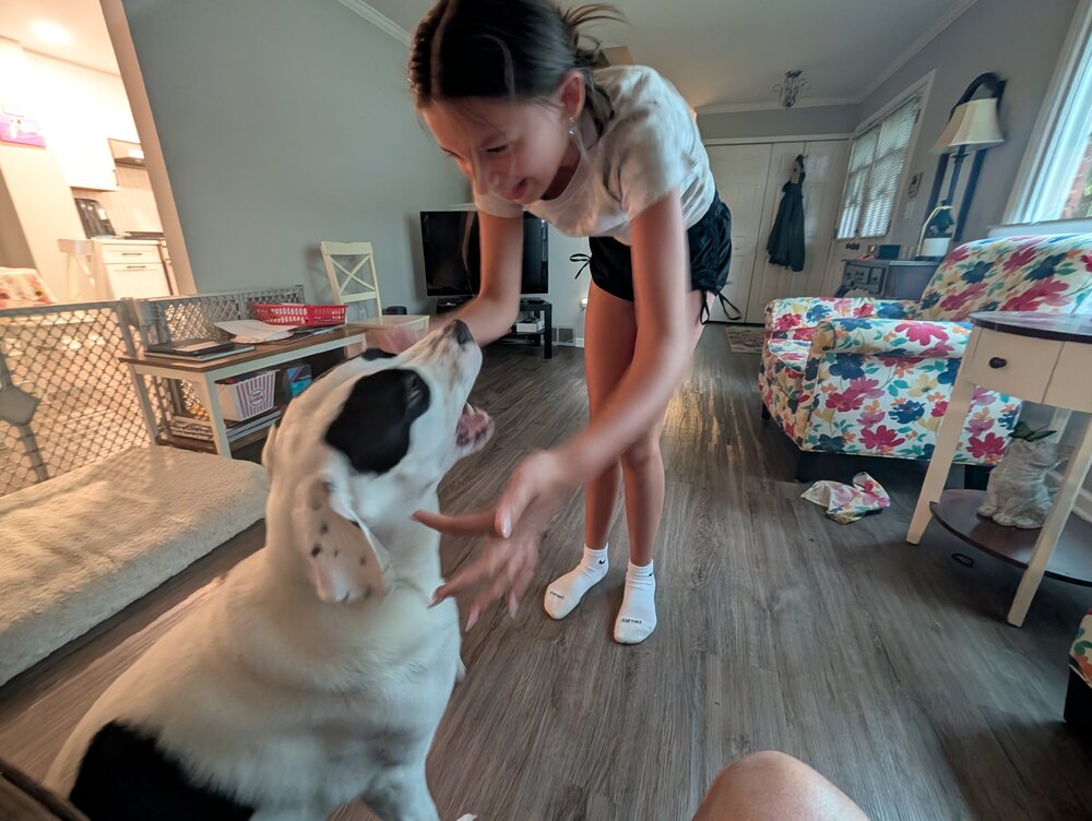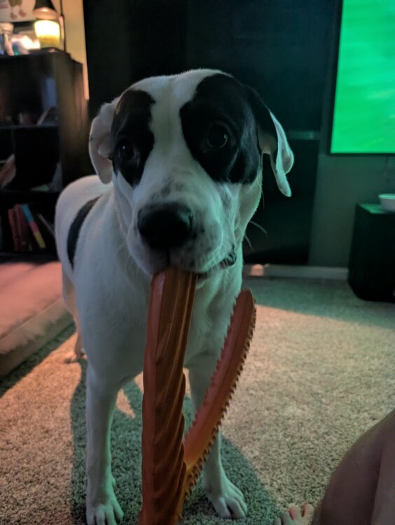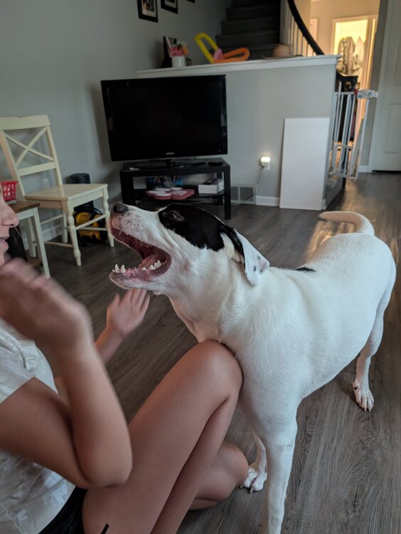 22. 145 lb Dane. So sweet and docile. They leave her with an e-collar on and access to the doggy door. I get a kick out of seeing people cross the street when she's out. She likes me more than she likes Trixie. Annoying little puppy keeps jumping on me but old guy just rubs my belly and gives me treats type energy.