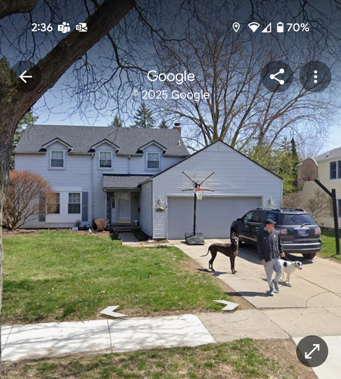 23. Got a text from our neighbor. I remember seeing the car but kind of forgot about it. Street View caught Trixie and I visiting Willow.