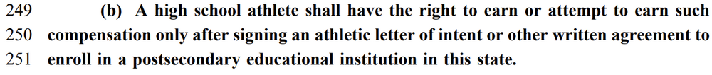 Makes sense. I have no idea how it will play out once those challenges actually come. I'm actually really interested to see how these challenges start popping up. One weird thing about the bill is they make it all about a student attending the school, not participating on the team like the Texas NIL bill. So to your point, if a kid is a highly ranked sophomore so they lock him up in a contract, but then he falls down the rankings or gets injured and enrolls as a normal student, there's going to be some unhappy folks. -