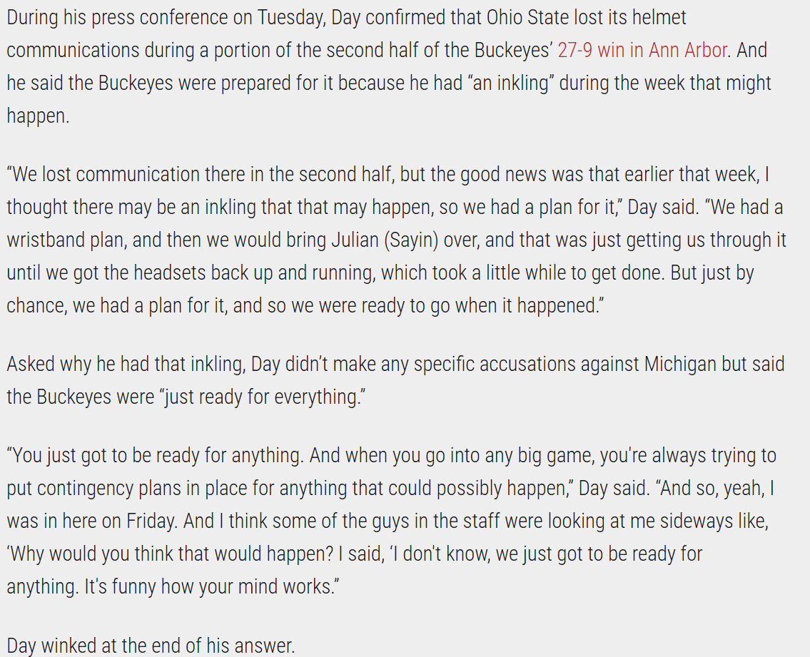3. It's being suggested Michigan engaged in subterfuge and sent an agent to go mess with our helmet comms. Seems petty (on both parties) and definitely irrelevant. We won. You lost. Nothing else matters. https://www.elevenwarriors.com/ohio-state-football/2025/12/160083/ryan-day-had-an-inkling-that-ohio-state-might-lose-helmet-communications-at-michigan-we-had-a-plan-for-it