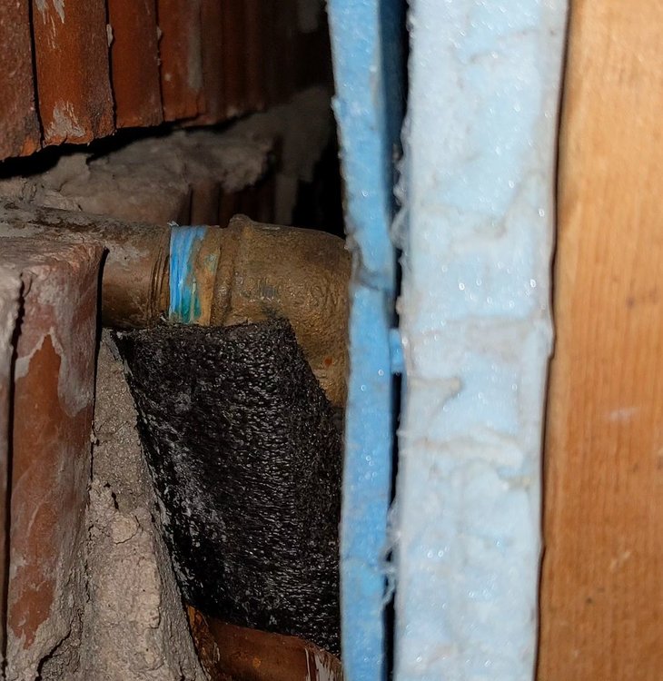 25. Here's an example of sloppy building practices in our CenTex houses. This is the pipe coming from the spigot on the north facing wall of my garage. Run between the brick and insulation/plywood. There's a nice cold breeze coming though the shitty mortar job too. I had wrapped it pretty good outside on Thursday but it was already frozen. I thawed with a hair dryer and re-wrapped. gonna try to insulate that as best I can, but will probably leave this hole in the sheetrock open to it so the warmer garage air can get to it. might need to look into heating up the garage in some way though.