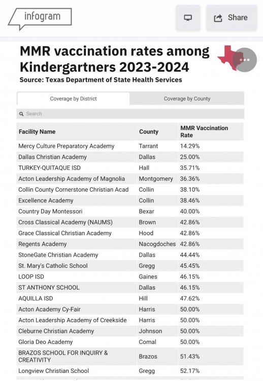 1. FOX 7 had a news story about measles vaccination rates, which included a chart to data from Texas DHS that allows you to search by school district. I sense a trend among the lowest rates of vaccination against measles. You can find the full chart here. https://infogram.com/mmr-vaccinations-1h1749wny3mdq2z?live