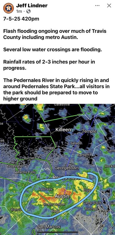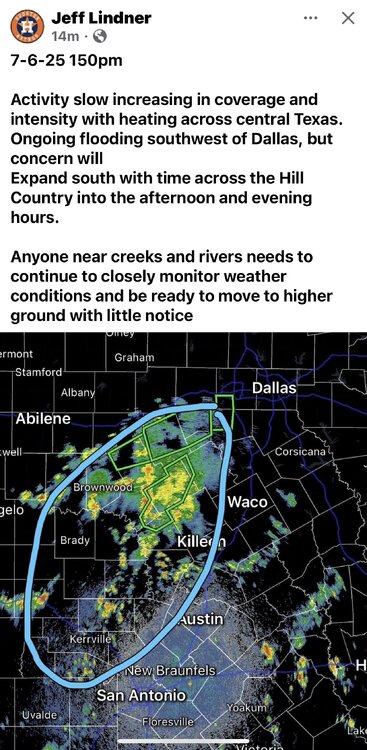 Lindner latest - TLDR 7-6-25 845am Update on the weather and rivers over the Hill Country and central Texas. No new flash flooding overnight Weather pattern remains in place today into Monday for additional heavy rainfall and flash flooding Persons should continue to be mindful of the weather conditions while visiting, camping, and vacationing in this area through tomorrow. The good news is that thus far there has been no new heavy rainfall and flash flooding, but recent radar trends west of I-35 suggest an increase in activity including pockets of heavy rainfall. Guidance continues to indicate the potential for additional isolated areas of excessive rainfall today, tonight, and into Monday over portions of the Hill Country and central Texas as the slow moving/stalled mid level trough axis/weakness aloft remains over this area combined with tropical moisture. As mentioned before, the where, when, and how much are the key questions in this type of setup and we are at the limit of the science on these answers usually until the storms begin to evolve. Where the heavy rain falls can quickly result in flash flooding on normally dry creeks and rivers…in some cases the water can rise feet in minutes yielding little time for action. Persons in vulnerable locations along dry or low flowing creeks and rivers must keep abreast of water levels and conditions and be prepared to react quickly. Rivers: Floodwaves have terminated into the various lakes in central Texas (Lakes Travis, Buchannan, and Canyon). These lakes remain well below normal conservation pools due to the long term drought in this area and will be able to fully absorb these flood flows with no downstream impacts or flood gates releases. It should be noted that higher than normal flows are occurring at several points in the Highland Lakes chain and significant debris has been washed into the various lakes in the last 48 hours making boating and recreational use hazardous at times. Rainfall below the control structures yesterday will result in rises on the Colorado River at Bastrop and Smithville today and the Guadelupe River downstream through Victoria this week. Based on current flows and forecasts no flooding is expected, but flows along the river will be elevated and normally dry low land areas will be inundated. Local: Rain chances will begin to increase over our local area into early this week in association of an upper level low that will approach from the northeast Gulf. This will usher in more favorable conditions for afternoon showers and thunderstorms along the seabreeze. Heavy rainfall will be possible as is typical in such summer situations with some isolated instances of street flooding through mid week. High pressure will attempt to build into the region later this week and lower rain chances, but how fast this happens is in question and thus far this summer significant high pressure has been unable to gain a strong foothold over the state or region and completely shut off rain chances. Summer patterns are hard to break once they become established given generally weak flow in the atmosphere this time of year. e