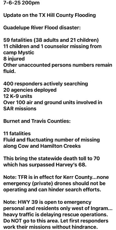 TX Flood Update (Sun PM) Heavy rainfall and flash flooding has redeveloped over portions of north Texas and recently over the Guadelupe River Additional heavy rainfall and flash flooding is possible tonight over the TX Hill Country Persons across central TX and the Hill Country need to remain informed on weather conditions that can change rapidly. Guadelupe River: Heavy rainfall has occurred in the last hour upstream of Kerrville in the Ingram and Hunt areas. Rainfall amounts of 1-3 inches have been recorded and this is expected to result in a rise in the Guadelupe River to above flood stage in the next hour or so with peak near 12 ft around Hunt, TX. At these level slow water crossings are flooded and impassable with fast flowing water and flow reaches the bottom of the HWY 39 bridge crossing. Areas upstream of Hunt may become cut-off on both the south and north Forks of the Guadelupe River. Ongoing search and rescue operations have been suspended in this area due to the threat of flash flooding and any persons near the river need to seek higher ground. Note: TFR is in place for Kerr County due to private drone interference with rescue operations along with other SAR activities. Note: Traffic congestion in this region is extremely heavy due to search and rescue efforts and influx of various support teams. Those not needing to be in this area should refrain from travel to the impacted areas. NC TX: Heavy rainfall focused this morning and early afternoon northwest of Waco and southwest of Fort Worth with several areas of ongoing flash flooding. Rainfall in this area has weakened and is shifting southward into a more unstable air mass over the I-35 corridor into the TX Hill Country. Forecast: Guidance generally shows activity weakening this eveninginto the overnight hours only to redevelop over the I-35 corridor and Hill Country on Monday. As we have been dealing with the last several days…isolated instances of extreme rainfall will be possible with very high hourly rainfall rates which will lead to rapid flash flooding of normally dry creeks and rivers. The locations and amounts of any significant rainfall amounts remain in flux, but the general air mass remains capable of some significant totals. Persons must remain aware of changing weather conditions in this area into Monday. The current statewide death toll has risen to 70 which has surpassed Harvey’s 68. While data is still be looked at and collect and numbers are fluid, this is one of the most fatalities from a flash flood event in the state of Texas in modern times. Kerr County: 59 Travis County: 5 Burnet County: 3 Williamson County: 2 Tom Green County: 1 These numbers were as of 245pm today. Jeff Lindner Director Hydrologic Operations Division/Meteorologist Harris County Flood Control District