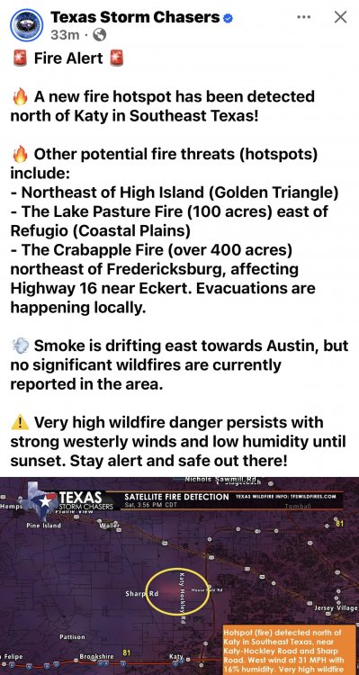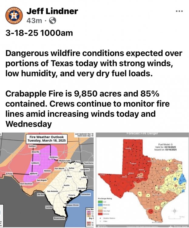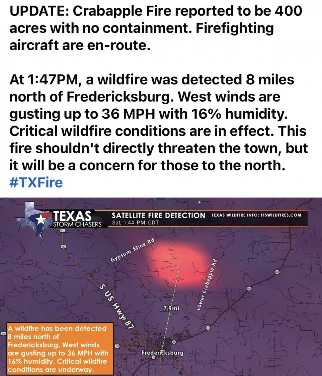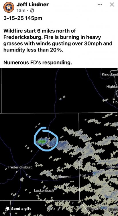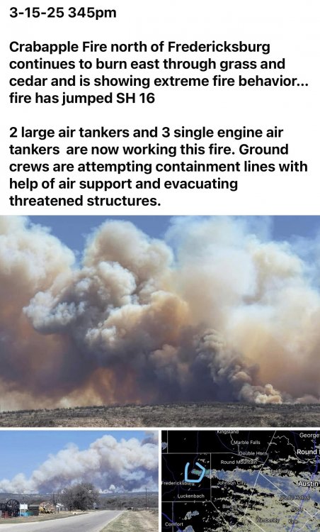 šø The Crabapple Fire began on March 15, 2025 and is located northeast of Fredericksburg, TX. This photo was taken along Highway 16 on the left flank of the fire towards where crews were doing structure protection on a house. Photo courtesy of K. Moran. Credit: Texas A&M Forest Service.