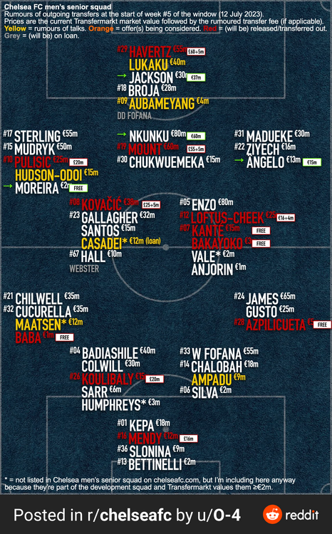 13. Current smoke. Auba to OM Ampadu to Leeds Ciacedo talks ongoing. Confidence on both sides. No other teams bidding. Angelo Gabriel signed and traveling with squad to US for pre-season tour. Casadei potential loan to LCFC CHO linked to Fulham Lukaku is a cunt. A graphic mostly up to date.
