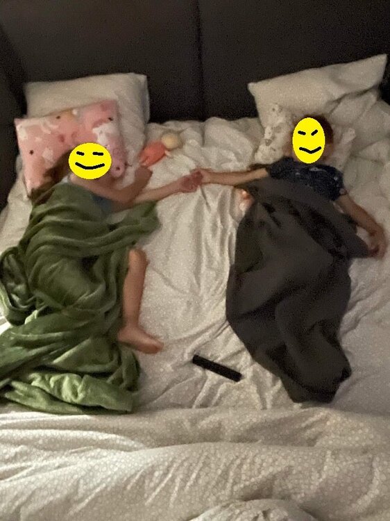 Our 4yo and 3yo fell asleep like this on Saturday night on the pull-out couch while watching movies. [Heart-Eye Emoji!] BTW, hang tight for those of you that are having a tough time. Ours are 19 months apart, so we had 2-under-2 for a bit. It may seem like it sucks now, but you'll probably reach a point down the road where you *wish* you could just wake up at 3am and rustle up a bottle to get them through the night and stuff like that. Or to have an hour or two just looking into your young baby's eyes, singing, shushing, while alternating between "damn, I love you so much" and "GO TO SLEEP MFER." Try to keep that perspective and realize that, like the cheesy song says, "you're gonna miss this." It's the advice we got many times over and it worked great for us.