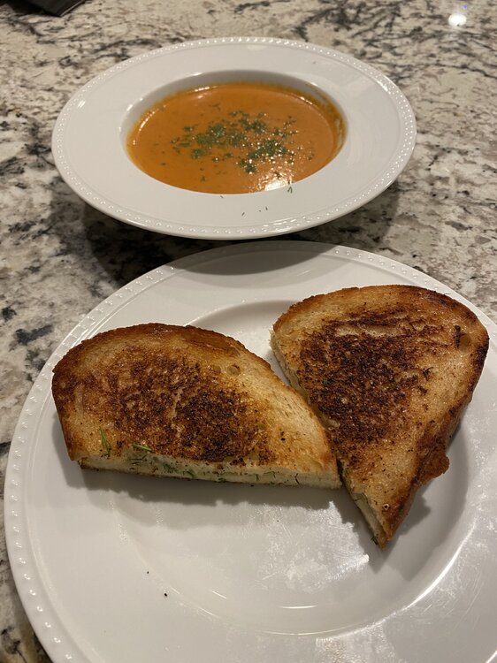 13. Made tomato bisque and white cheddar grilled cheese on sourdough. Added some fresh dill to the grilled cheese and as a topper on the soup, which worked out really well.