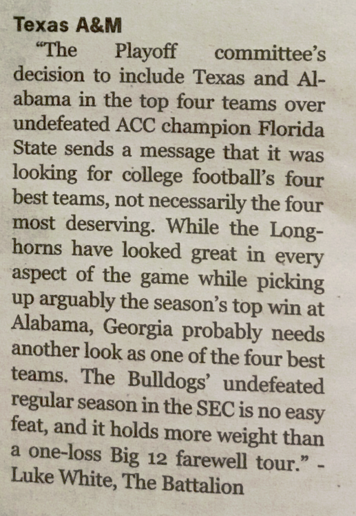 23. I grabbed the latest The Daily Texan while on campus since it is a Sugar Bowl edition. The editors interviewed other Big 12 and SEC schools about Texas making the CFP. Most said something like Sucks for FSU If Bama was in, Texas had to be in Texas looks good expect for aggy. Here's what The Battalion had to say: