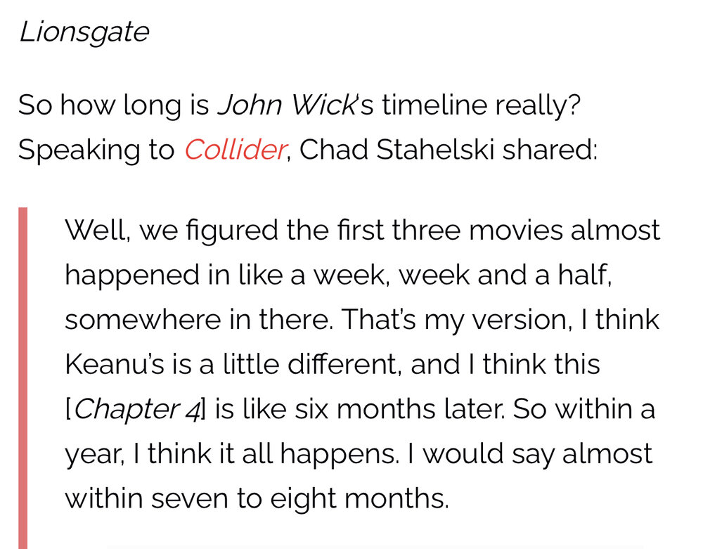 4. I don't recommend watching part 2 and 3 back to back. Exhausting. Take a break in between. After rewatching I realized parts 1-3 have occurred over just a week or so, based on comments by characters about JW actions like losing wife,dog,car. confirmed by director: