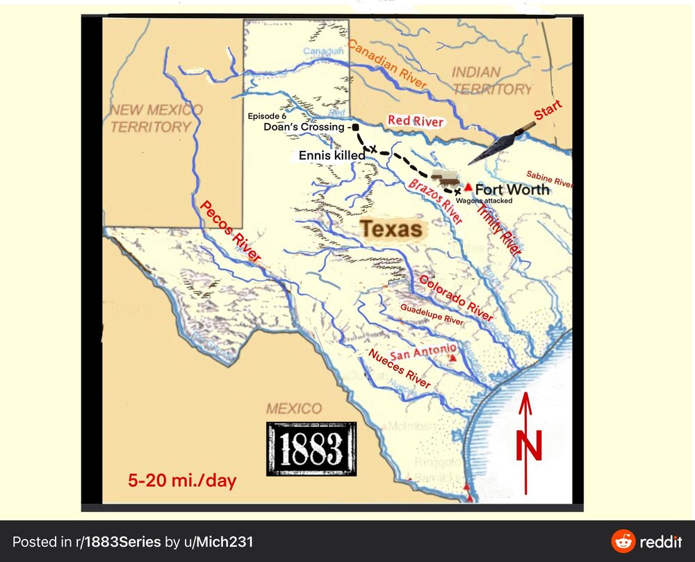 24. It's funny doing a quick google search on how far the group has traveled on 1883. Tons of articles and reddits about how viewers are confused. "Why didn't they have a route plan before?" "They aren't going to make it to Oregon until Season 20" "Over five episodes, the wagon train has covered an area that takes about a two-hour drive. Walking, it’s about 51 hours. They’ve taken about a week to travel 150 miles."