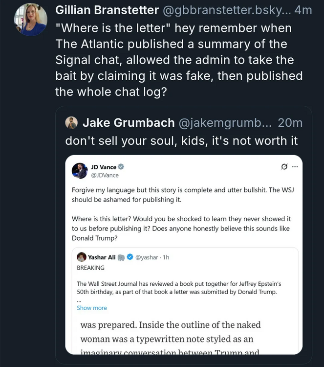4. Another thing - MAGA hasn’t been blaming Trump. They were blaming Bondi. The problem is that Trump trusts Bondi and doesn’t want to get rid of her. Backing her has not worked for him and made the situation worse. IMHO he’s going to have to fire her in order to get this to die down.