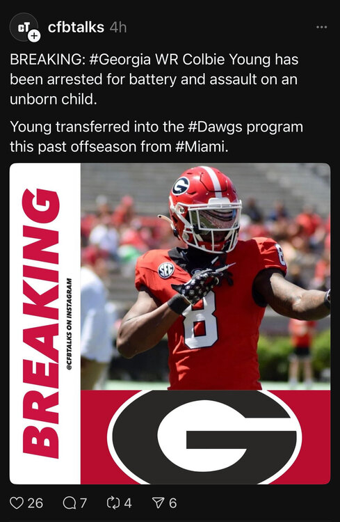 7. https://www.threads.net/@cfbtalks/post/DA3YQUOR7_p?xmt=AQGzMZP8_BsDwveEFgJJnSqOOBm0amcWBjPBaFj_V060bw https://www.dawgnation.com/football/georgia-wr-colbie-young-arrested-assaulting-an-unborn-child-battery-charges/TQG45UL57JFLXHVY3MCI62OPZU/