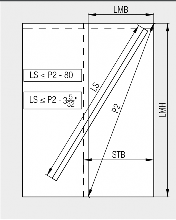 13. I think I answered my own question for #3. The length of the running track must be shorter than the diagonal clearance (P2) by at least 80 mm (3 5/32''). LMB = inside clearance LMH = inside height STB = sliding door width P2 = diagonal clearance LS = running track