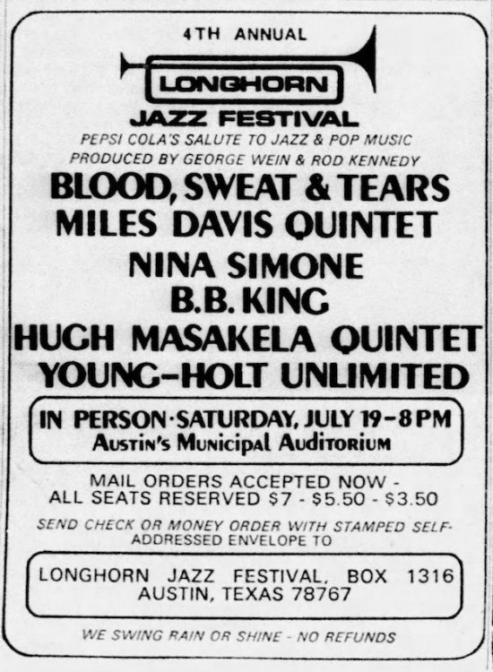3. One of my worst was also one of my best. 4th Longhorn Jazz Festival at Memorial Auditorium in July of 1969. Blood Sweat and Tears couldn’t find one of their nine matching microphones and held the audience hostage for an hour waiting for the guilty party to return it. I don’t know if it showed up, but the show finally resumed. Childish behavior from supposed professionals. Great performances from Miles Davis (whom we came to see), Nina Simone, and Hugh Masekela, but the night was soured by BB&T antics.