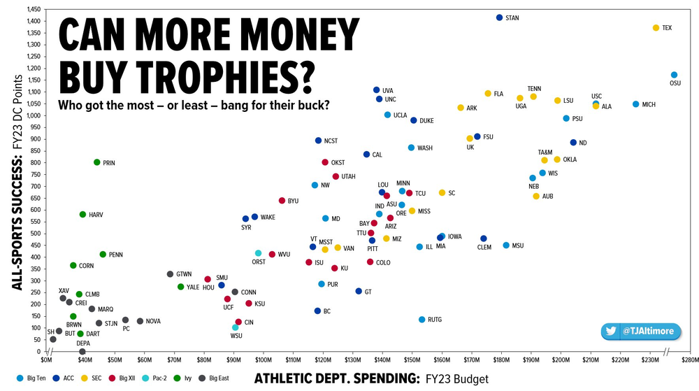 16. Depends on what you’re counting I guess. When was the last time either of those played for a conference title or had a team with playoff potential late in the season? I just don’t see much of a difference between those programs. If we’re counting resources I assume aggy would be towards the top of the list but I don’t think many would put them before anyone I had above them (save maybe Tennessee). And likewise UCLA is hurting for money right now but I don’t think anyone truly believes they be permanently at the bottom of the pack. Maybe you’d rather I just list them in tiers Tier 1- bluebloods and those moving that direction SEC(6): Alabama, Florida, Georgia, LSU, Oklahoma, Texas B1G(4): Michigan, Ohio St, Pedo, USC Other(3) Notre Dame, Florida St, Clemson Tier 2- above average programs SEC(3): Auburn, Tennessee, aggy B1G(5): Michigan St, Nebraska, Oregon, Washington, Wisconsin Other(1): Miami Tier 3- average, where most of college football lives SEC(5): Arkansas, Kentucky, Mizzou, Ole Miss, South Carolina B1G(4): Iowa, Minnesota, Northwestern, UCLA Other(7*): K State, North Carolina, NCSU, Oklahoma St, TCU, Virginia Tech, West Virginia (stopping at 7 but I assume you get my point, the majority would be here) Tier 4- below average SEC(2): Mississippi St, Vanderbilt B1G(5): Illinois, Indiana, Maryland, Purdue, Rutgers Other(3*): Duke, Kansas, Virginia