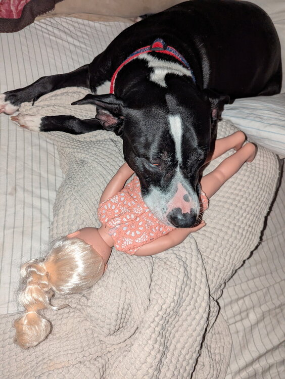15. Rescue pit update. Little girl spent the night at my parents. "My" dog was not amused. Wife found him like this
