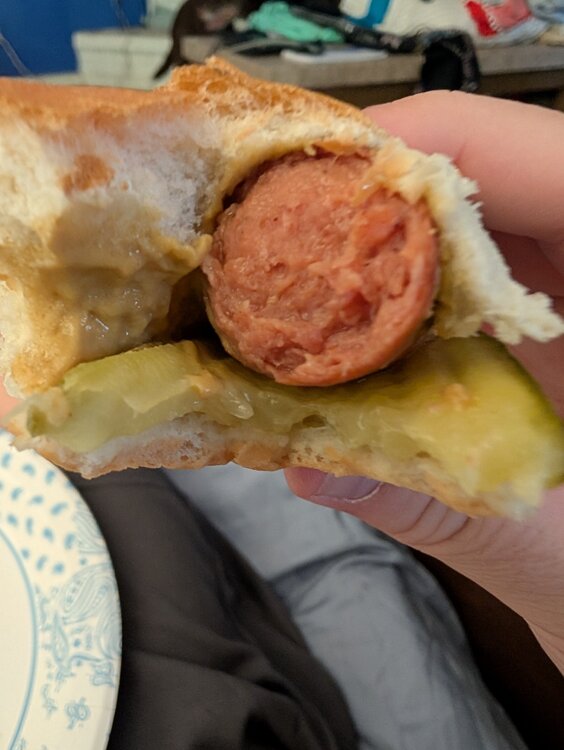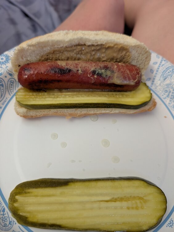 11. Little afternoon snack. Left over HEB beef dog, some German mustard, and a Nathans pickles