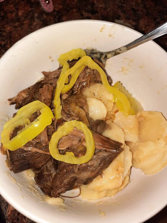 13. Some instant scalloped potatoes. Left over mississippi roast. Some peppers Sent from my SM-A515U using Tapatalk