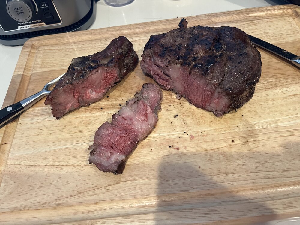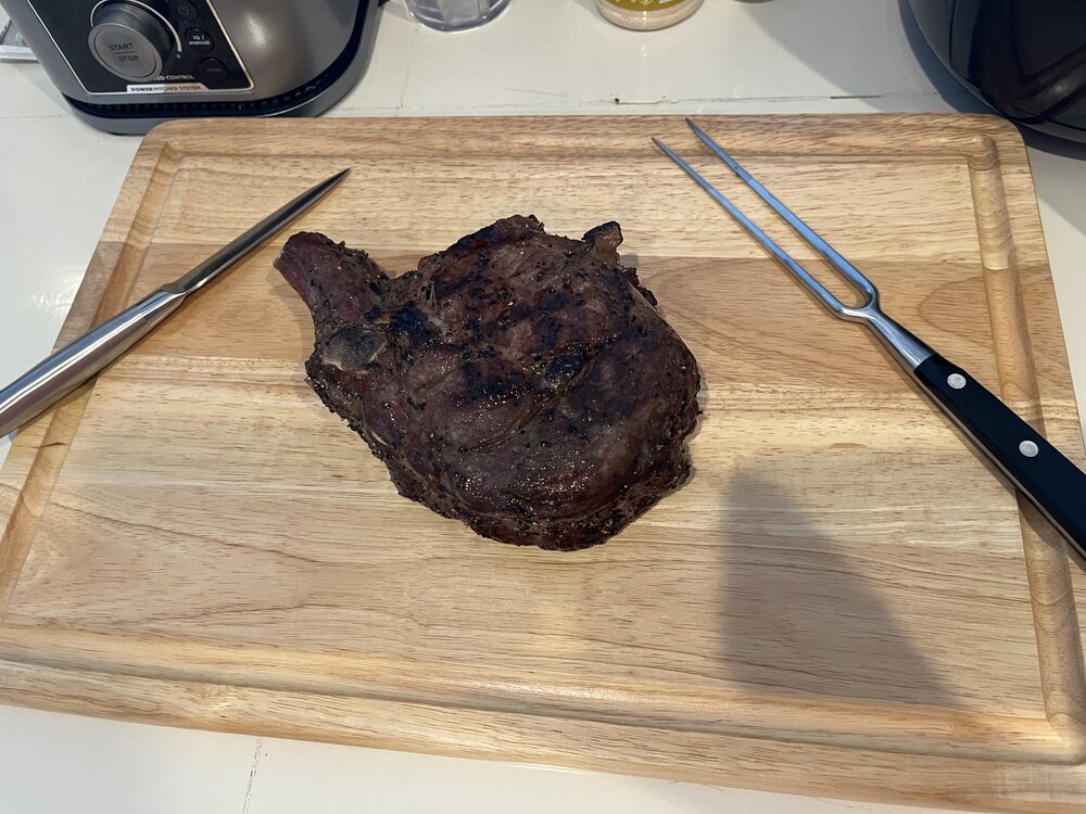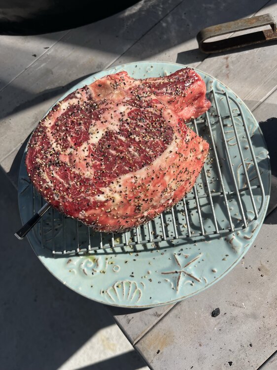 24. 36oz bone in rib-eye, dry brined, smoked with pecan at 225* then reverse seared.