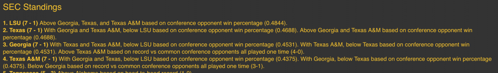 20. Makes sense, I think the results show “what happens if these teams finish 4-1 AND there are no other upsets in the SEC”. Using that same calculator these teams can all finish 7-1 and we can make it depending on what happens in the other games (I just played around with random results for the other games for a second).