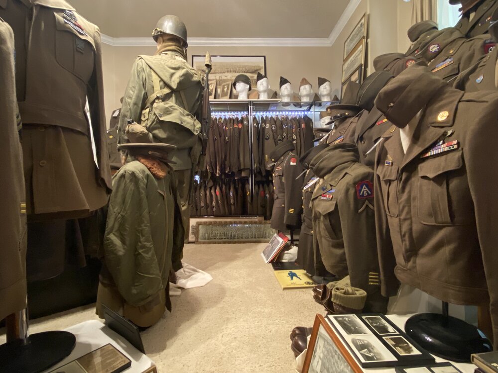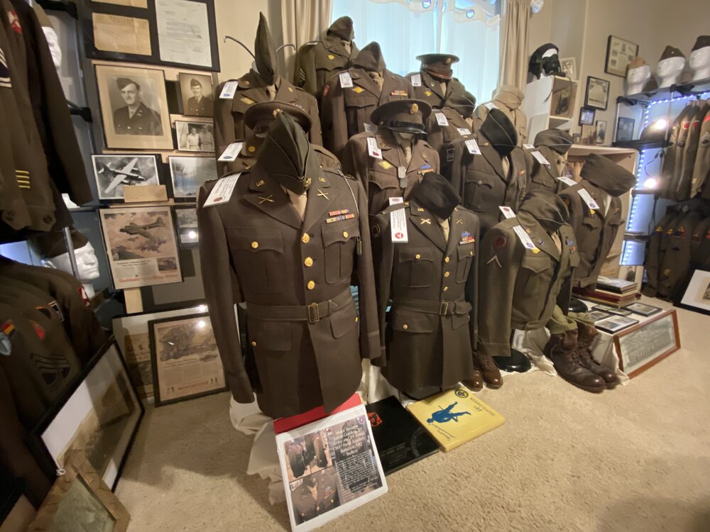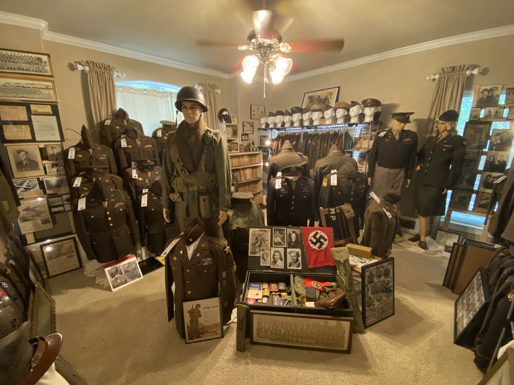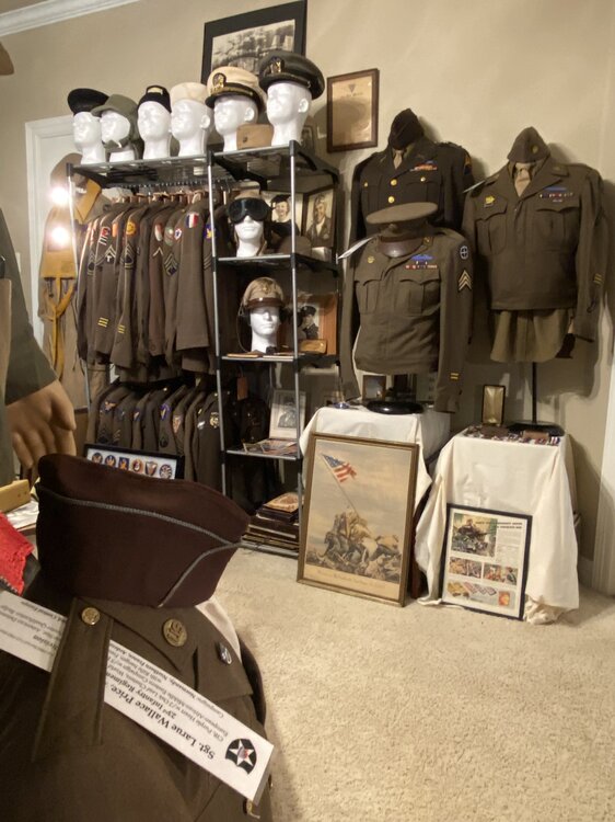 The below picture reflects part of my collection. Many of the uniforms displayed are of soldiers that participated in D-Day. Regarding museums. As many of you noted some of you have, or know someone that has, donated something to a museum. Unless it is some unique item it will most likely end up in a box in the archives never seeing the light of day. Though I have no direct experience with the situation I have been told that some of these items will be sold off by the museum to raise funds. Initially, my thoughts were to eventually donate my collection to a museum but have since changed my mind and will liquidate it myself so that I, or my kids/grandkids can enjoy the money instead. And, in case something happens to me prior to liquidation, I have a spreadsheet with descriptions and an estimated value of my items so that the stuff won't just be thrown in a dumpster. Though I do not have the foot traffic that museums have I do have people that come over to view my collection. I have an electronic file of each uniform and a history of each soldier that is represented by a uniform. If you notice in the photos there is a white strip on the shoulder. That is basic information regarding the soldier of the uniform displayed.