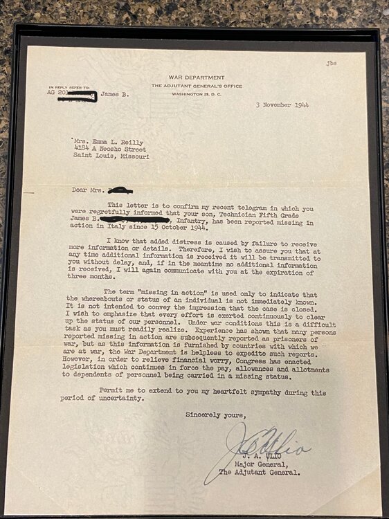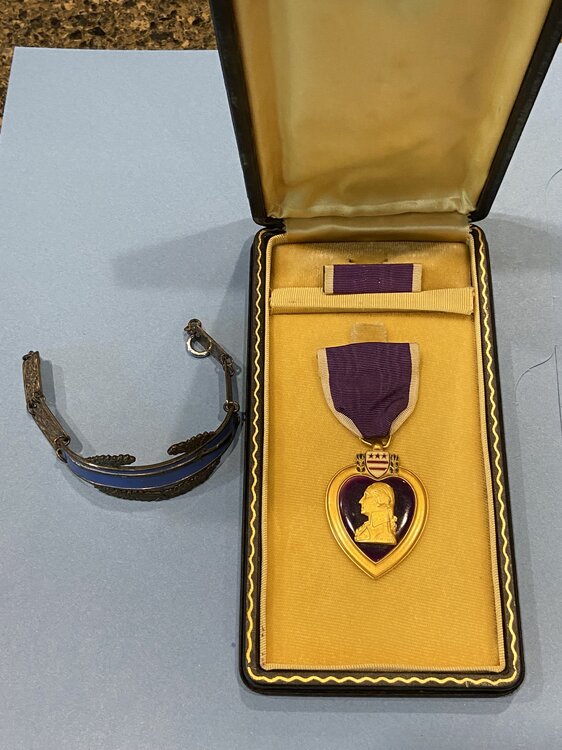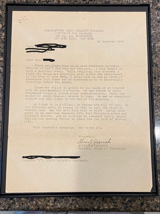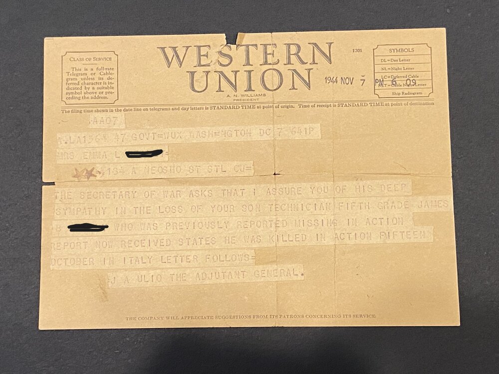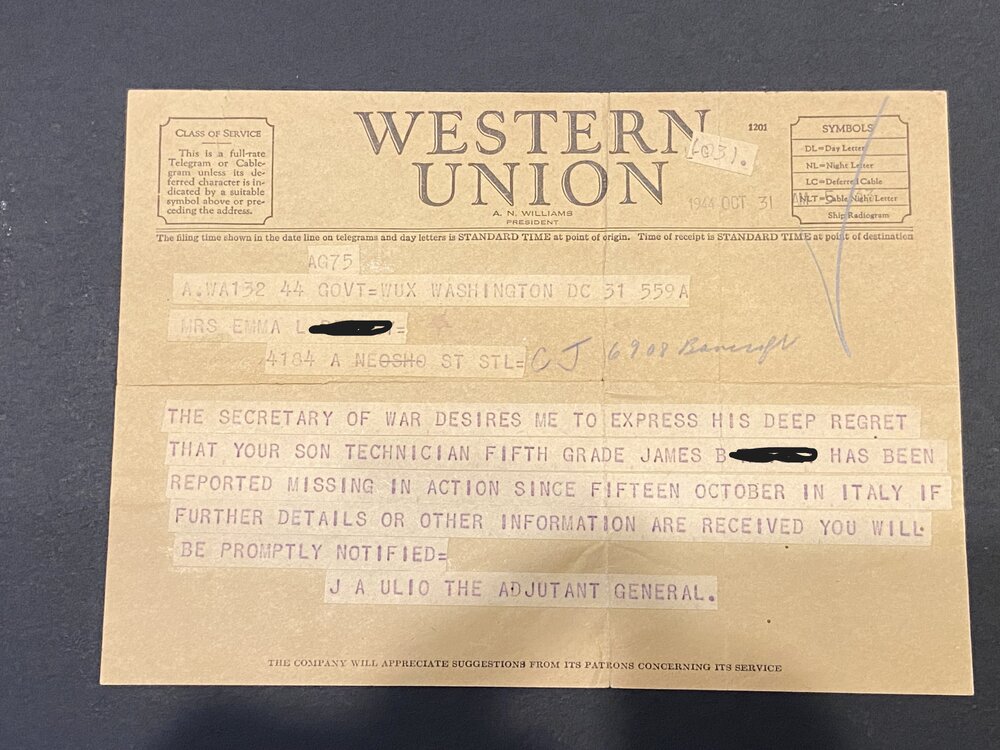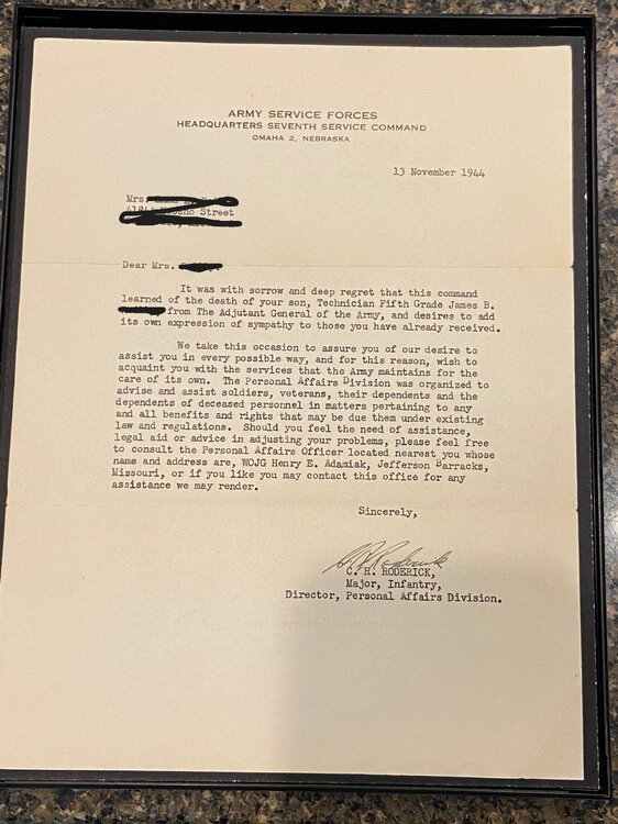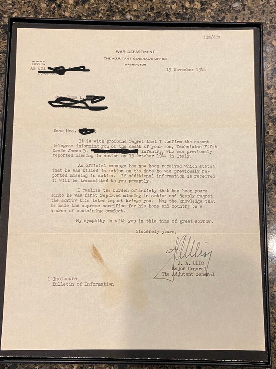 A very moving moment in Saving Private Ryan is when the mom receives the news that she lost a son in the War. That scene played out thousands of times during the War. Though not directly related to D-Day, the below images are a series of announcements in my collection of a soldier that was first MIA and then later declared KIA. All of the correspondence is directed to his mother. I also have a series of another soldier that was KIA that are addressed to his wife. Notice the dates of the information. No doubt that the mother lived in hope and anguish for a long time. The first image is a Western Union Telegram from Oct 31, 1944 declaring that her son has been MIA for 2 weeks The second image is a WU telegram from Nov 7, 1944 stating that he is KIA The third image is an official announcement from Nov 3, 1944 declaring him as MIA The fourth is an official announcement from Nov 13, 1944 declaring him KIA The fifth is an official announcement from Nov 15, 1944 declaring him KIA The sixth image is an announcement citing the cause of death. The other documents that I have (not shown) of a soldiers death spans a greater time period. The first WU Telegram stating him being MIA was dated March 12, 1944 with the next WU Telegram advising him being MIA was dated Aug 6, 1944. The wife went 5 months not knowing the status of her husband. Personally, I find it amazing that family members get rid of items like this to only be purchased at a flea market. I do what I can with my collection to keep these brave men and women remain "known". The bracelet is made from a Combat Infantry Badge with the links naming the battles that the soldier was in.