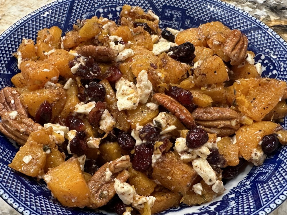 6. Smoked pork chops, butternut squash with toasted pecans, dried cranberries, and feta, and grilled romaine.