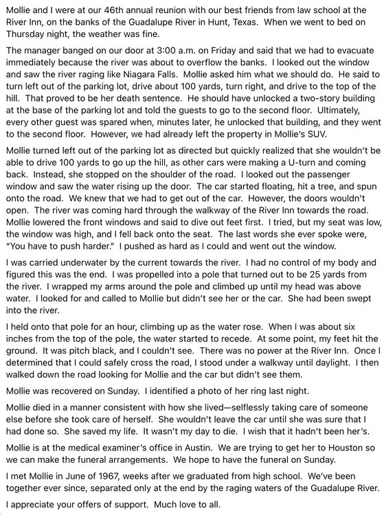 9. Texas Monthly. Litigation - even expensive litigation - ending 13-14 years ago, should not be a factor in this tragedy. Certainly, no impact on government failures. And, hard to imagine it prevented them from staying up and remaining plugged in, posting a watchman, etc. on a night that called for it.