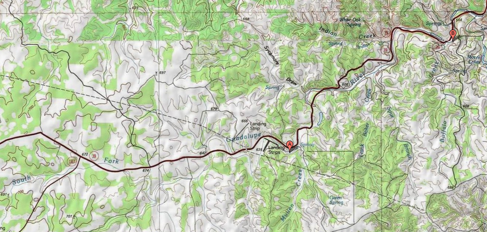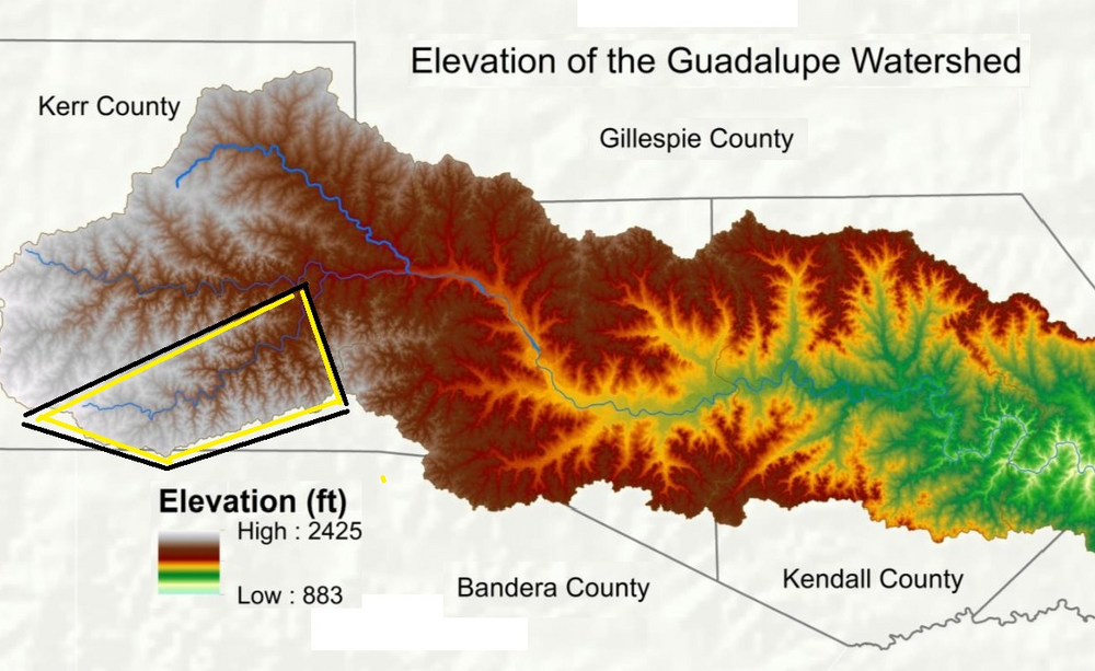 19. this cap of the topo is pretty much the entire drainage watershed of the south fork above mystic (marker B) marker A is 6.5 miles southwest of mystic it's dry as a bone for years at a time, but it clearly has a geologic history of being subject to the same event that happened thursday night: the road at the top is 39 the area between the "river bed" and 39 is the floodplain from erosion events like thursday night here is the streetview of the house on the right: https://maps.app.goo.gl/741GBi5MGCgvn9z18 the dry riverbed, erosion escarpment from water accelerating through the curve in the path (see: the bernoulli equation), and obvious floodplain clearly indicate this same event has transpired for thousands of years and i have no doubt that this exact same flood has happened at least twice since the settlement of kerr county in the 1840s, but the institutional memory expired before all of the camps were built post-war the drainage watershed of the guadalupe south fork is relatively small but it obviously can become very powerful i'm going to stop there because this line of inquiry is heading towards an indictment of good people in a time of tragedy