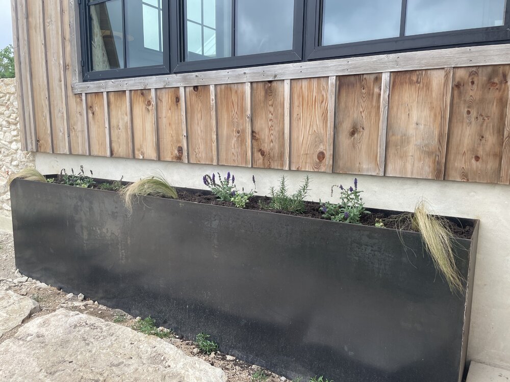I had a big section of exposed foundation near our mudroom entry that I was having a tough time figuring out how to deal with. It was kind of narrow, so it was gonna be hard to do any big plants to soften the space. I had some 1/4" steel plate cut to spec, then welded up a raised planter box. 16" deep and about 36" high. I forgot to take pics during the build, but I used 1x1x1/8" angle iron to stiffen everything up and cross-brace it. Finished it with Penetrol as a clear coat. It'll take some maintenance, but I didn't want it to rust out, and I didn't want to paint it. Planted a few smaller plants, and hoping the rosemary spills over. May do some ivy at the base too. Still need to fill in the gap between the steps and the box with some decomposed granite or mulch if I go with the ivy, but really happy with how it turned out.