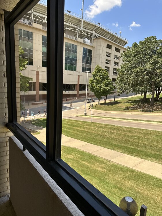 2. Jr is in Walton and got resident reserved parking in the stadium garage right next door. Football is going to be interesting for him, because his bed might literally be 100 ft from the stadium. This was taken from right outside his dorm room.