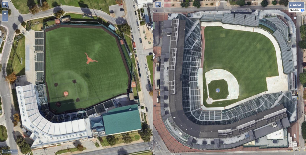 How much space is really needed? Seems like Comal could be turned into a pedestrian road like Speedway and that road north of the stadium could be moved or wrapped around the tennis courts and you're done. Here's Disch-Falk vs Wrigley, same scale. We don't need anything close to that capacity. For Wrigley, I love the left and right field bleachers and the little odd nooks and crannies they create, and love the seats down the line that angle in to face the field. -